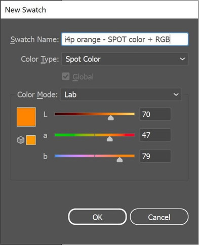 先新增一個新色票,例如:我建立一個 ‘i4p – orange – SPOT color + RGB’(i4p是insights4print的縮寫) 的色票。顏色類型選擇特別色,顏色模式是Lab,如此我就可以利用這個色票得到絕對的特別色定義。建立後,再複製它,開啟複製檔,將選項改為塗佈紙CMYK值,然後再複製一個,改為非塗佈紙的。
